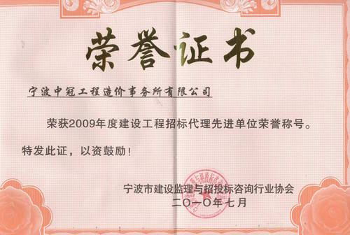 2009年度建設工程招標代理先進單位榮譽稱號-中冠榮譽-中冠咨詢-中冠工程管理咨詢有限公司