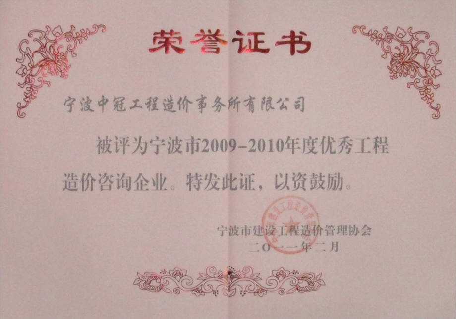 寧波市2009-2010年度優秀工程造價咨詢企業-中冠榮譽-中冠咨詢-中冠工程管理咨詢有限公司