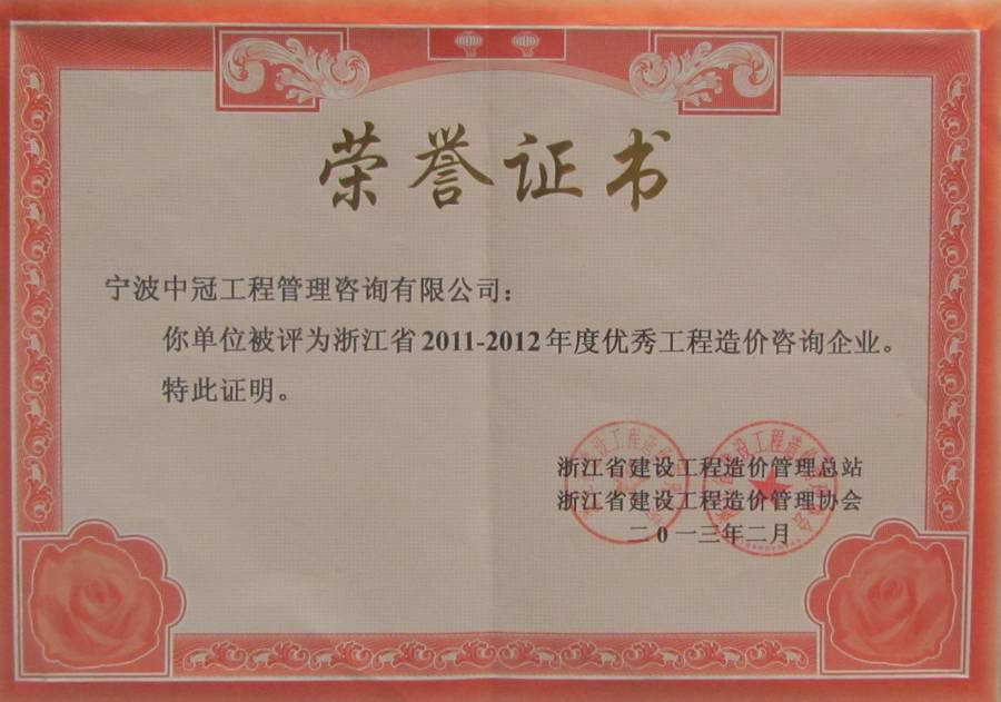 浙江省2011-2012年度優秀工程造價咨詢企業-中冠榮譽-中冠咨詢-中冠工程管理咨詢有限公司