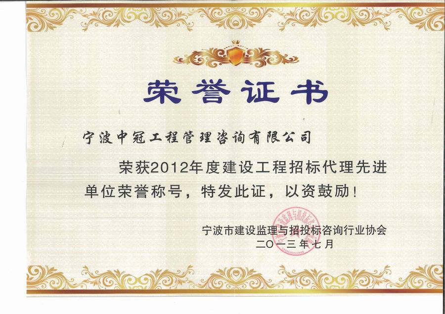 2012年度建設工程招標代理先進單位-中冠榮譽-中冠咨詢-中冠工程管理咨詢有限公司