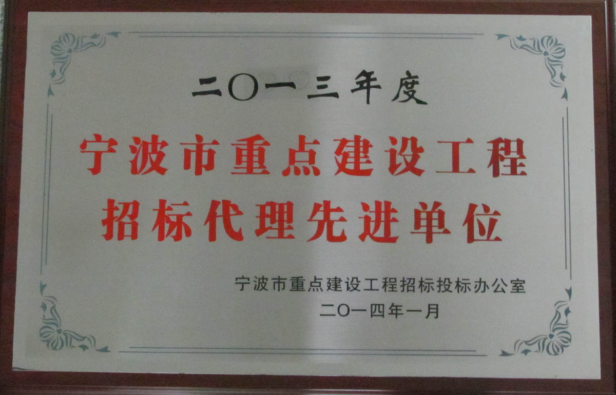 2013年度“寧波重點建設工程招標代理先進單位”-中冠榮譽-中冠咨詢-中冠工程管理咨詢有限公司