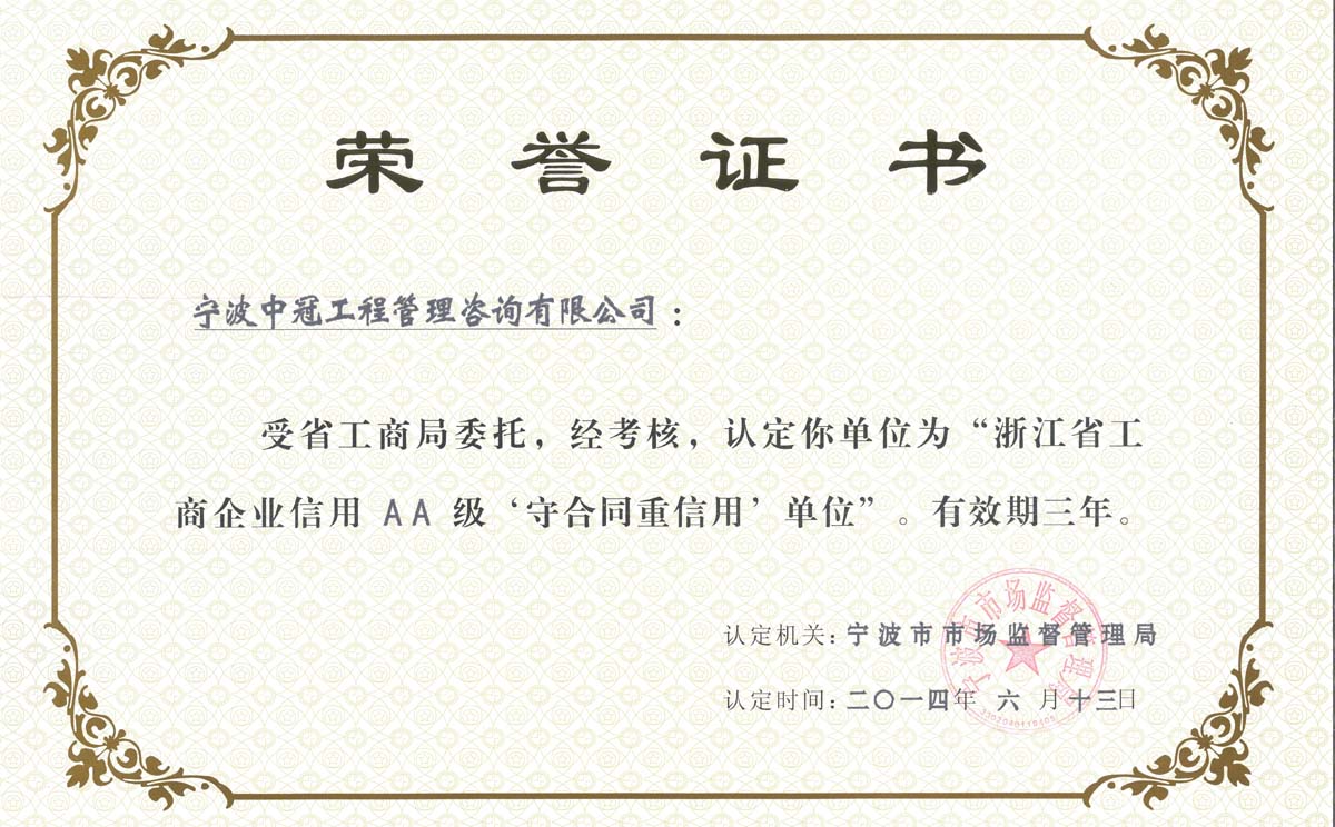 浙江省工商企業信用戶AA級‘守合同重信用’單位榮譽證書-中冠榮譽-中冠咨詢-中冠工程管理咨詢有限公司