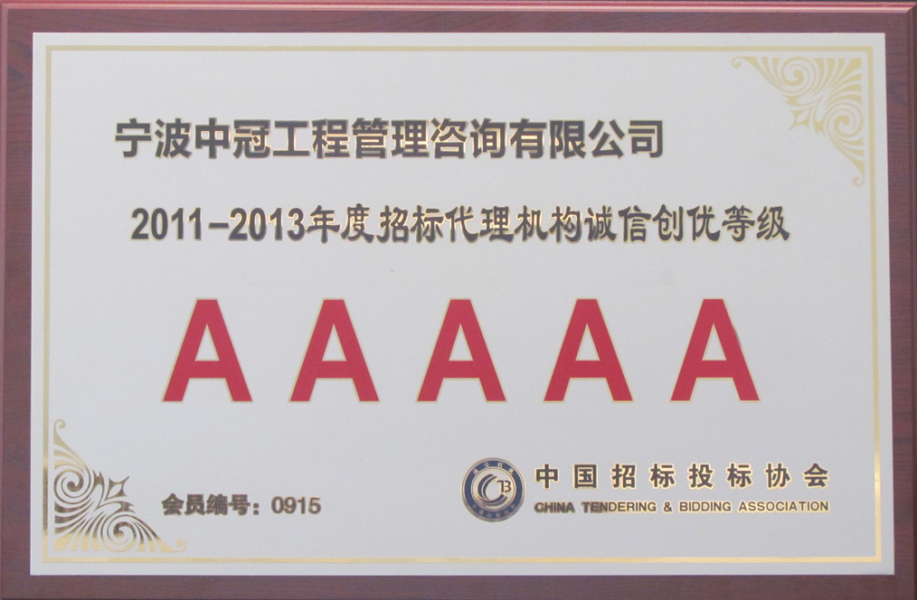 2011-2013年度招標代理機構誠信創優等級證書5A-中冠榮譽-中冠咨詢-中冠工程管理咨詢有限公司