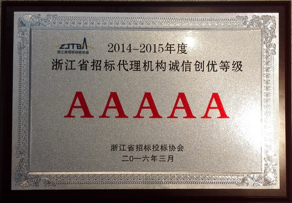 2014-2015年度浙江省招標代理機構誠信創優等級AAAAA