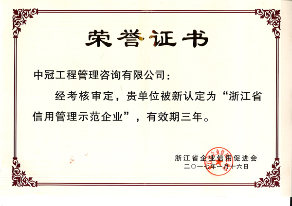 “浙江省信用管理示范企業”榮譽稱號-中冠榮譽-中冠咨詢-中冠工程管理咨詢有限公司