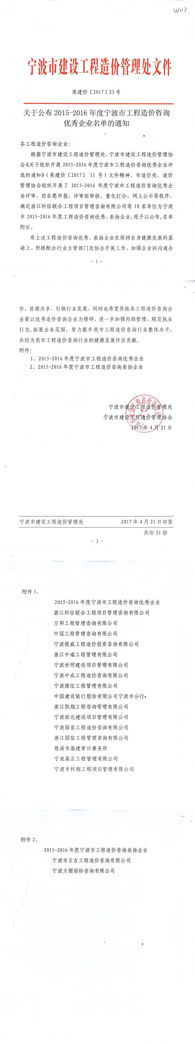 “2015-2016年度寧波市工程造價咨詢優秀企業”榮譽稱號