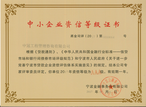 “2017年度中小企業資信等級AAA級”榮譽稱號-中冠榮譽-中冠咨詢-中冠工程管理咨詢有限公司