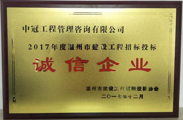 根據溫州市建設工程招標投標協會近期發布的《關于發布“2017年度溫州市建設工程招標投標優秀誠信企業”名單的通知》,我公司被評選為“2017年度溫州市建設工程招標投標優秀誠信企業”。